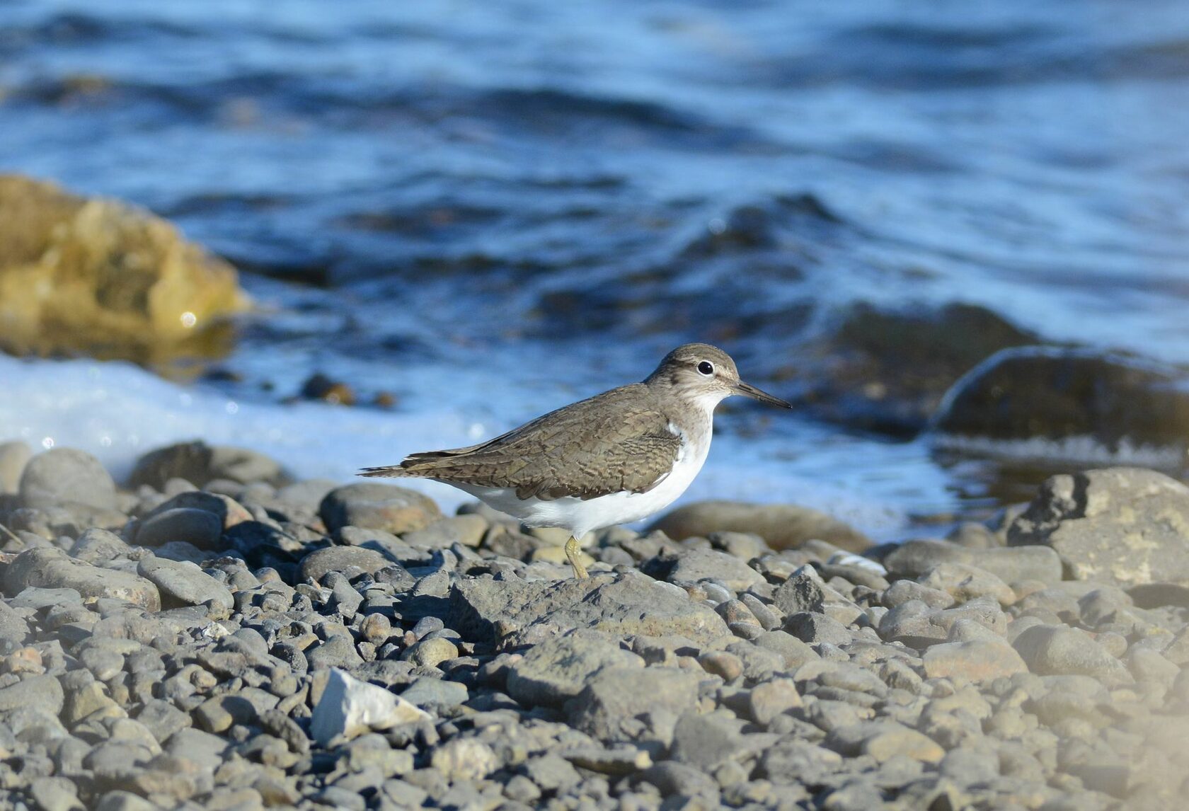 Полевые признаки. Небольшой кулик (45−58 г) с темным клювом и относительно короткими зеленовато-серыми лапами. Спина бледно-коричневая, шея и грудь в темных пестринах, живот и подхвостье белые. В полете хорошо заметны белые полоски на крыльях. Летает невысоко над водой или берегами, издавая при этом свистящую позывку; сидит на камнях или бегает вдоль берега, раскачивая хвостом. Полет немного необычен для куликов: быстрые взмахи чередуются с фазой скольжения на неподвижных крыльях.