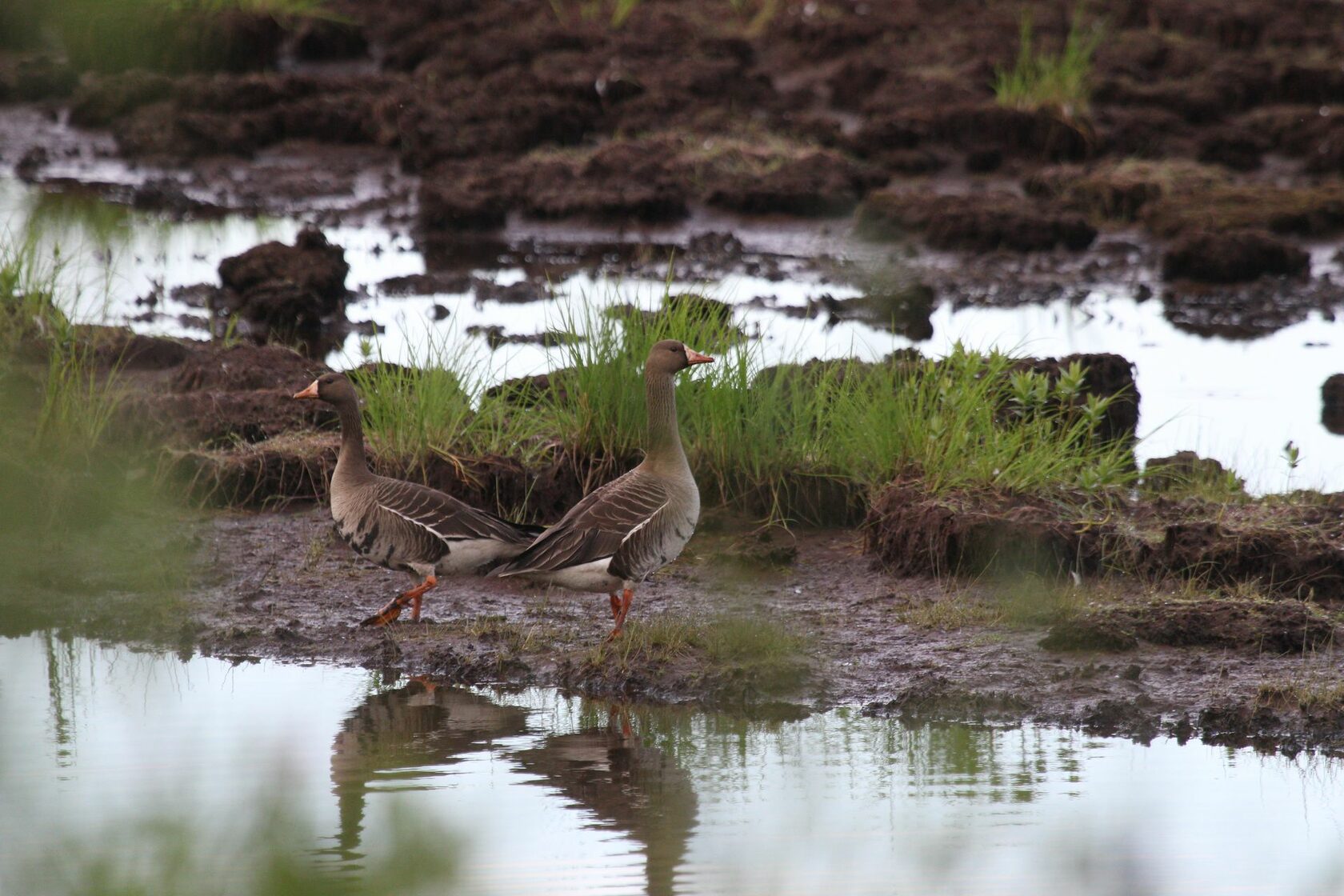 Полевые признаки. Гусь средней величины (2−3,2 кг) с розовым клювом и оранжевыми лапами. У взрослых птиц на фронтальной стороне головы заметное белое пятно, на животе поперечные черные полосы («тельняшка»). Молодые птицы монотонного охристо-серого окраса. От пискульки взрослые птицы отличаются меньшими размерами лобного пятна и отсутствием вокруг глаза желтого кожистого кольца.