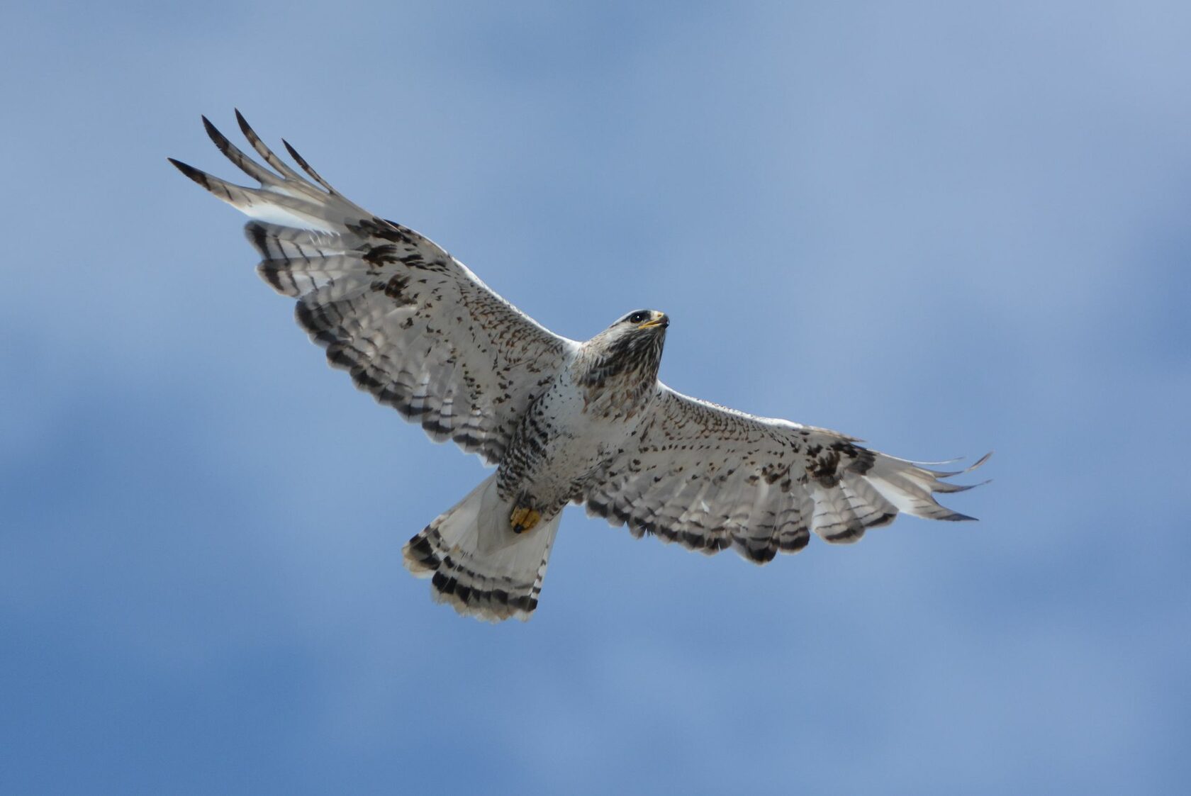 Полевые признаки. Крупная хищная птица (0,9−1,1 кг, самки крупнее самцов) с коричневой радужиной и желтыми лапами, плюсна оперена до самых пальцев. Спина и крылья темно-бурые, голова охристая, на зобу темные продольные пестрины. Живот черный, подхвостье белое. Хвост белый с широкой темной полосой по внешнему краю. Подкрылья белые, на сгибе крыла видны крупные черные пятна. Молодые птицы светлее взрослых. Полет маневренный, с частым парением, зависаниями, резкими подъемами и пикированием.