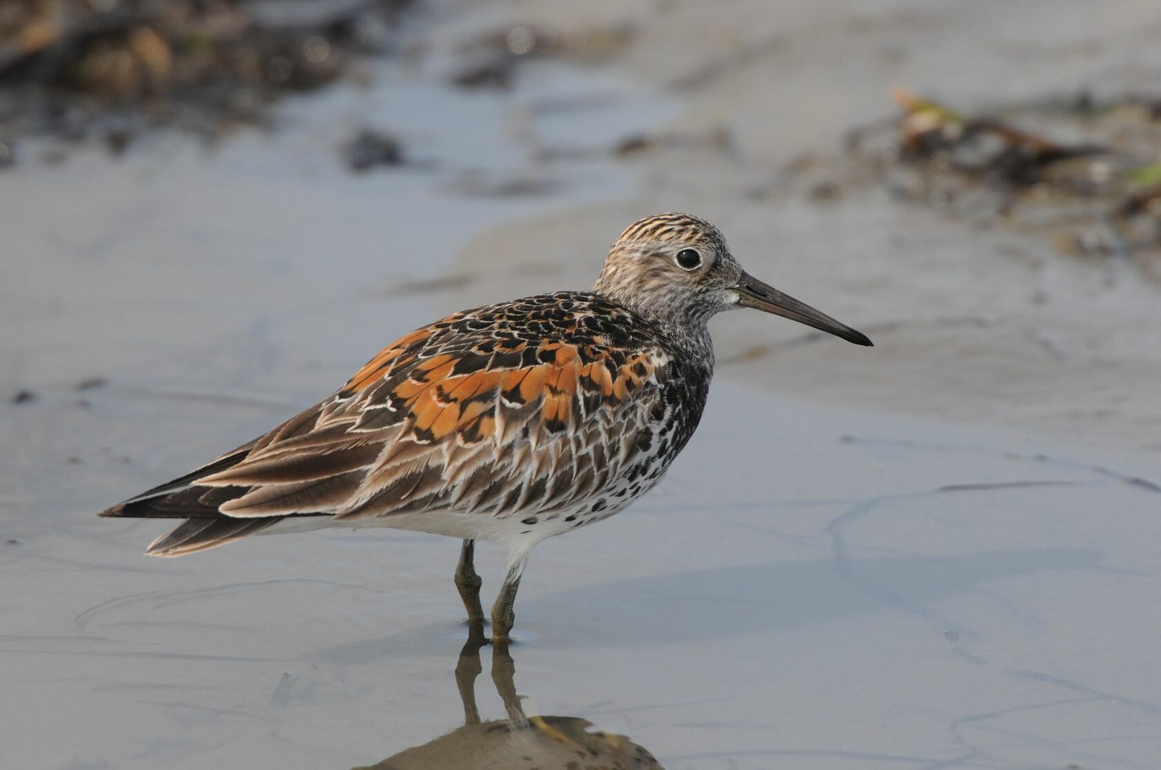 Полевые признаки. Крупный кулик (120−180 г) с прямым крепким клювом и относительно короткими лапами грязновато-зеленого цвета. Спина темная с охристыми пятнами на плечах. Грудь и бока в контрастных пятнах, живот и подхвостье белые. В зимнем оперении спина у большого песочника однотонно-серая, живот и надхвостье белые.