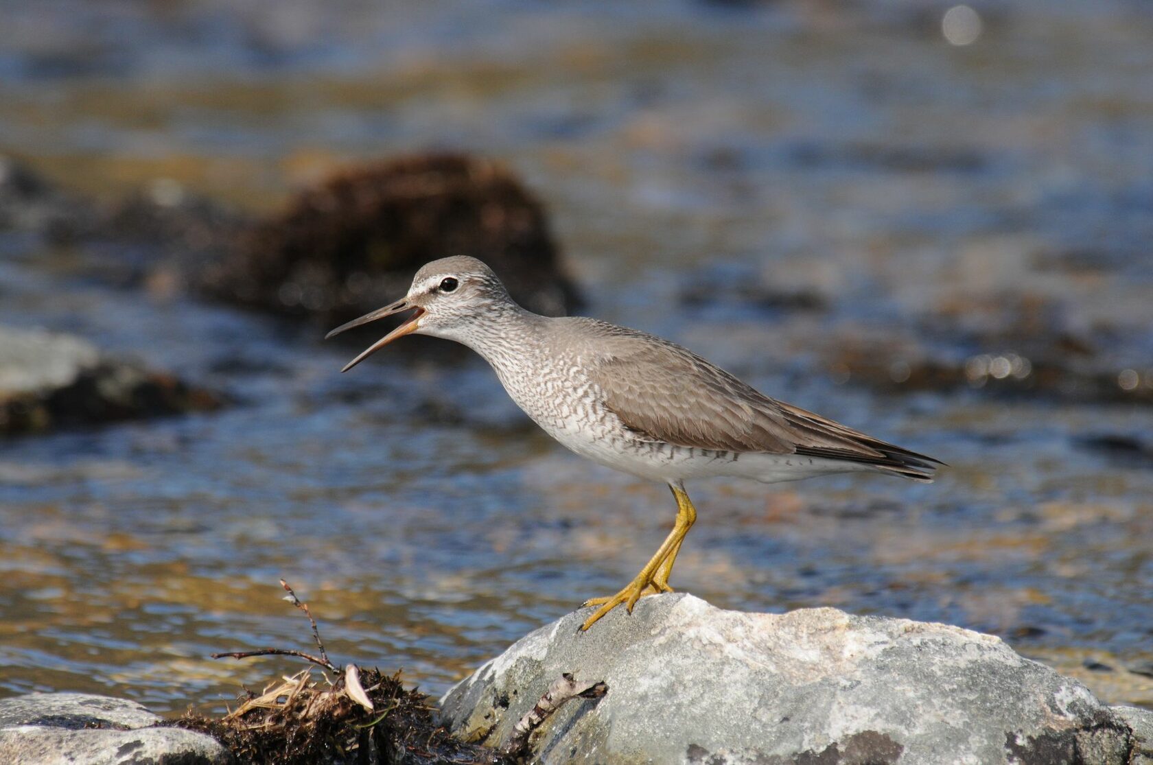 Полевые признаки. Средней величины улит (110 г) с относительно короткими желтыми лапами и длинным темным клювом. Верхняя часть тела и крылья монотонно пепельно-серые, живот и подхвостье белые, хвост и надхвостье тоже серые. На груди и боках волнистый поперечный рисунок. От клюва над глазом тянется белая полоска.