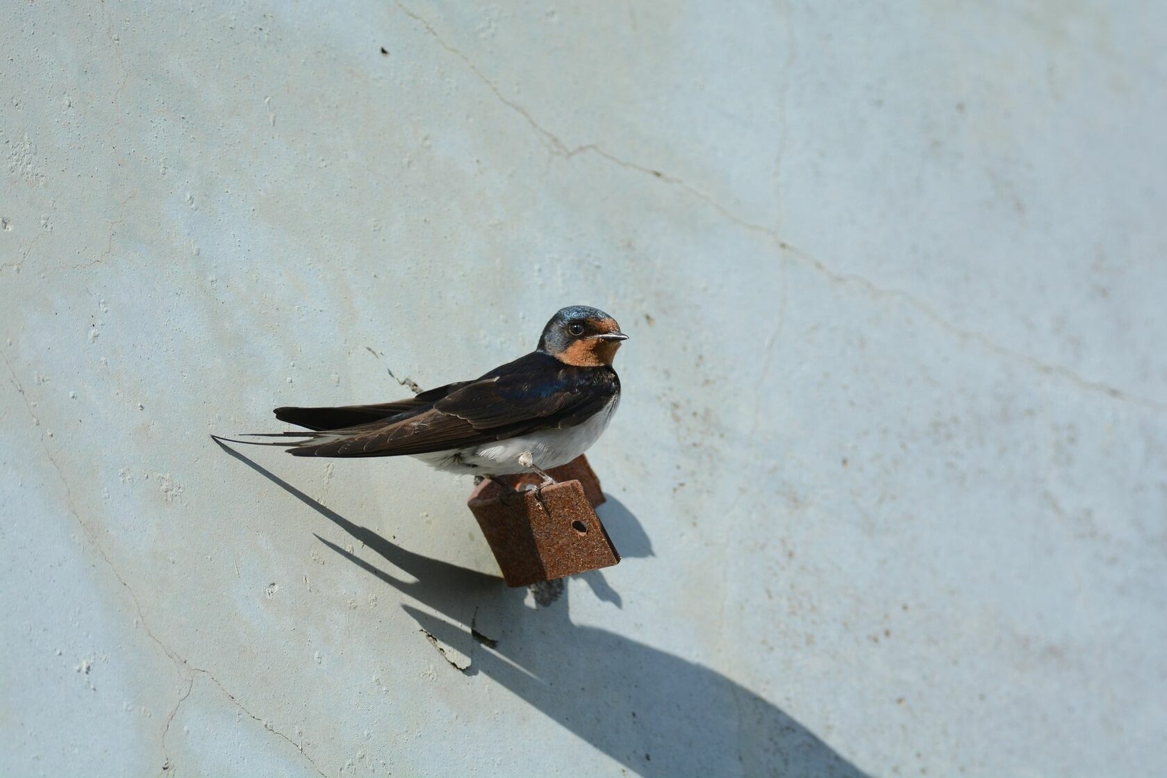 Полевые признаки. Небольшая (14−17 г) изящная птица с коротким клювом, острыми крыльями и длинным в форме вилочки хвостом. Темя, затылок, плечи, спина и надхвостье иссиня-черные; грудь, живот и подхвостье белые с розоватым налетом. Лоб и горло кирпично-ржавые, зоб охвачен черной перевязью. Полет стремительный, маневренный.