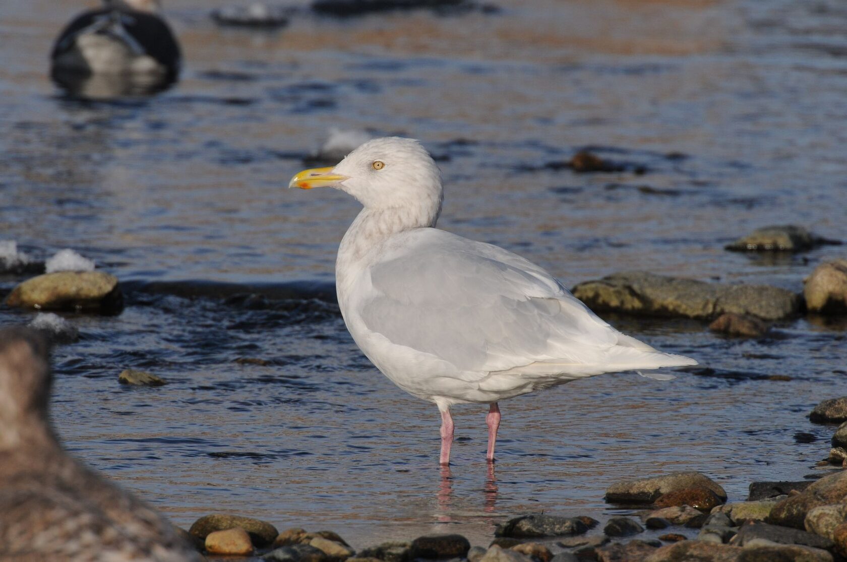 Полевые признаки. Большая белоголовая чайка (масса 1,5−2,2 кг); ноги бледно-розовые, клюв желтый, на подклювье красное пятнышко. Спина и верхняя часть крыльев светло-серые, концы крыльев белые. Грудь и брюхо также белые. Молодые птицы монотонно бурые.