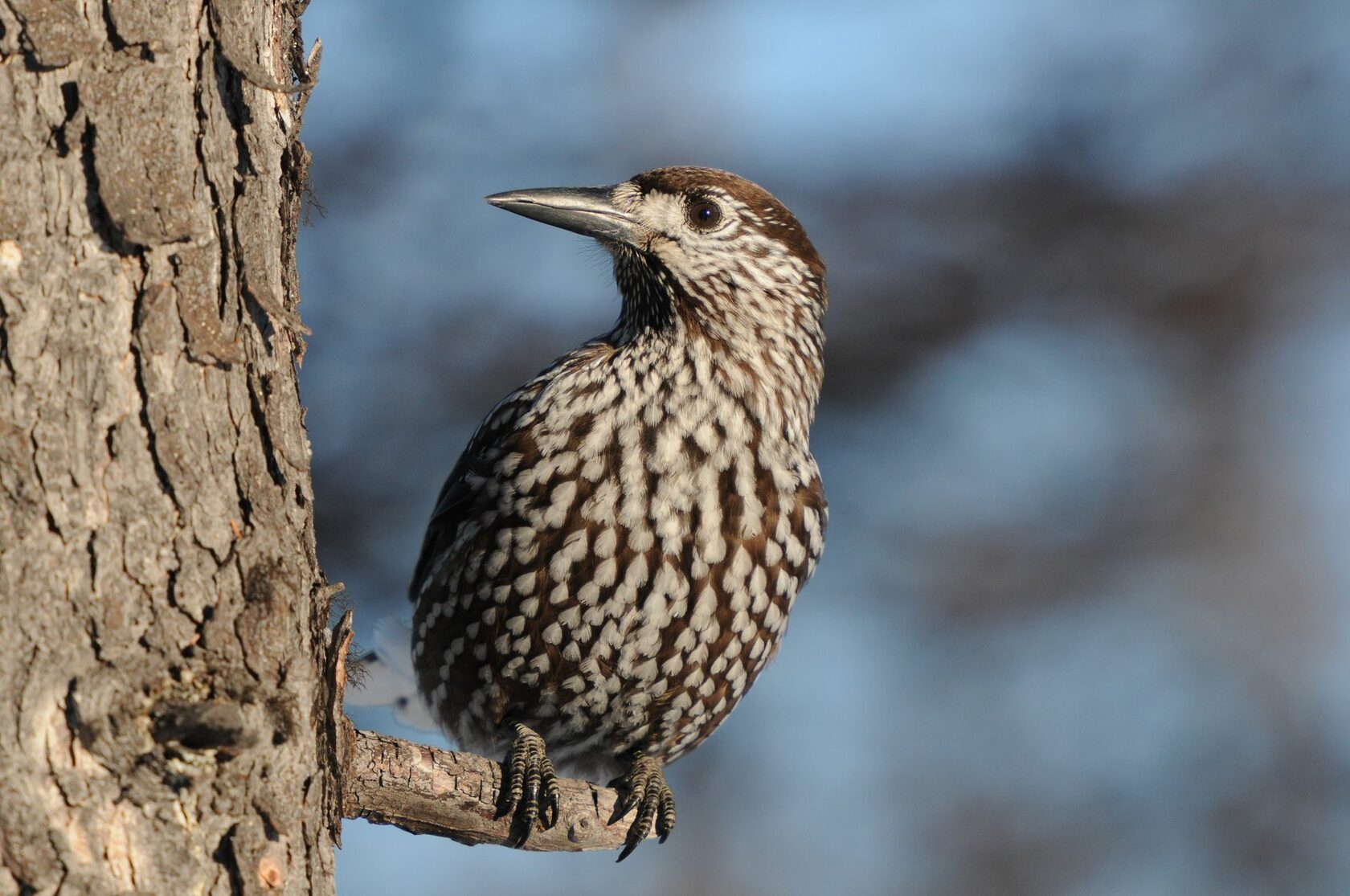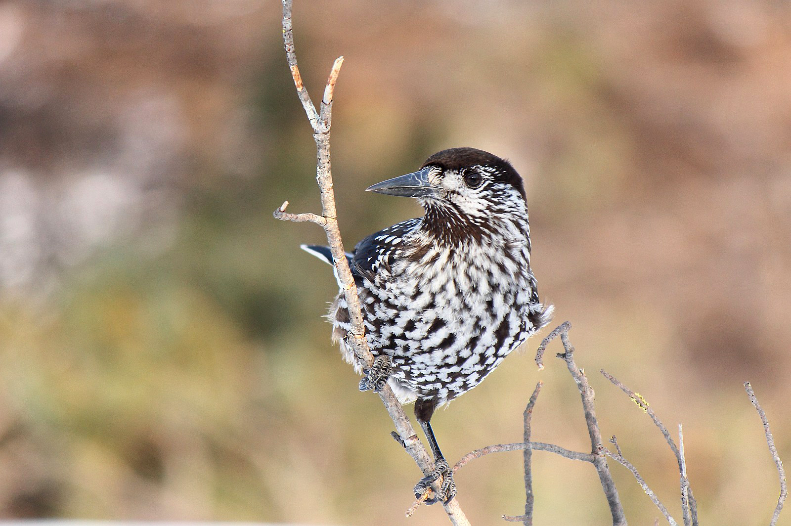Полевые признаки. Средней величины врановая птица (масса 170−200 г) с крепким длинным клювом и сравнительно коротким хвостом. Темя и зашеек темно-бурые, спина и грудь буроватые с рисунком из белых пятен. Надхвостье и подхвостье также белые. Рулевые перья черные с белыми пятнами на концах. Крылья короткие с округлой вершиной. Зимой часто сидит на вершинах деревьев, издавая резкие позывки.