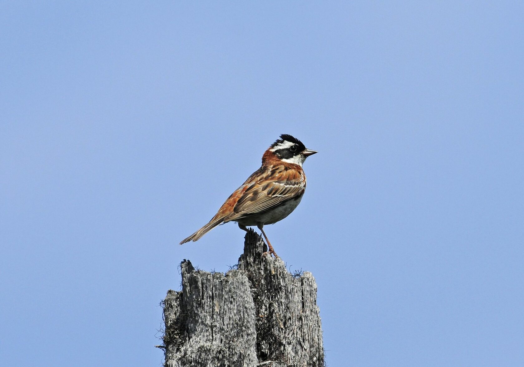 Полевые признаки. Овсянка среднего размера (масса 20−23 г) с коротким клювом и хохолком на темени, который заметен у птиц обоих полов. У самцов шапочка и щеки черные, над глазом белая «бровь»; горло, «усы» и нижняя часть тела тоже белые. Шея, зоб и надхвостье коричневые, на спине темные продольные полосы. Самки отличаются коричнево-бурой окраской головы. Песня — громкая короткая рулада, видовая позывка — тихое овсяночье «слип».