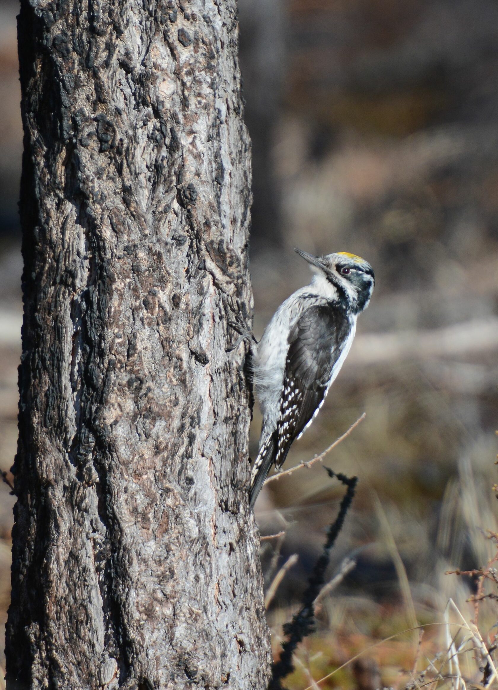 Полевые признаки. Небольшой дятел (70 г) с тремя пальцами на лапе, четвертый редуцирован. У обоих полов спина, затылок и горло белые; через глаз тянется черная полоса; в нижней части спины темные продольные пятна. Низ тела светлый с размытым темным рисунком из поперечных полос на животе и продольных пятнышек на груди. У самцов ярко-желтая «шапочка».