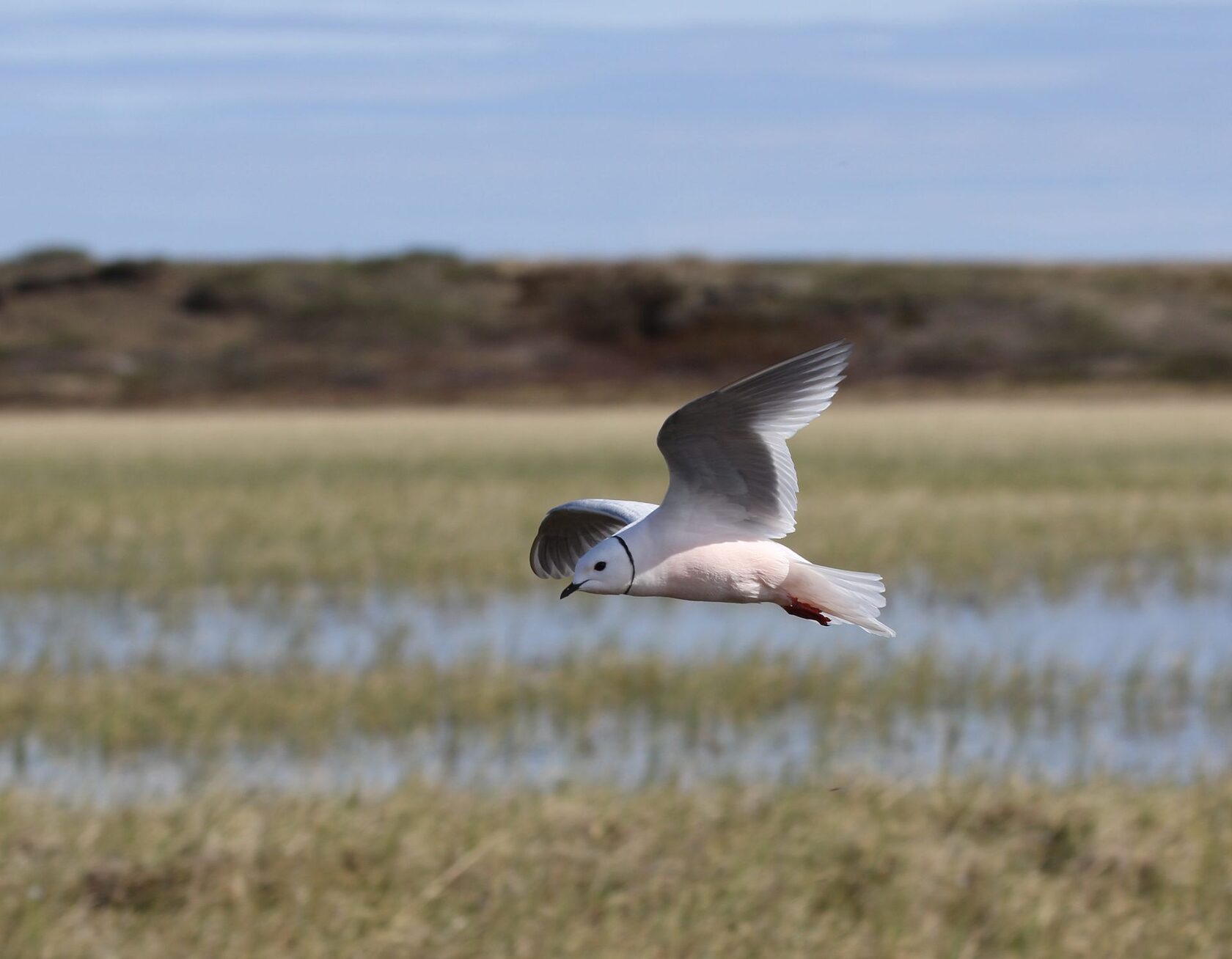Полевые признаки. Небольшая чайка (масса 150−180 г) с узкими крыльями и клиновидным хвостом. Спина и верх крыльев пепельно-серые; голова и низ тела розовые, на шее черное «ожерелье». Клюв темный, полость рта, края век и лапы ярко-красные. К концу лета розовый цвет становится почти белым. У молодых птиц спина охристо-черная, темя и затылок темные; крылья округлые, на плечах и хвосте темная перевязь. В полете легка и грациозна.