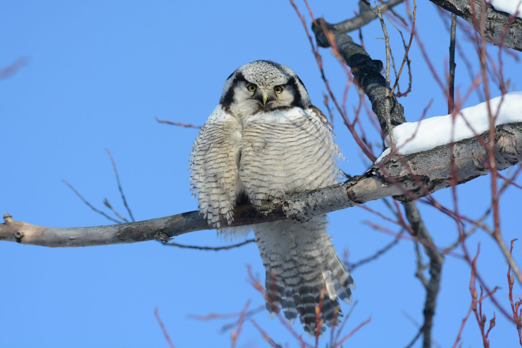 Особенности биологии. Численность ястребиной совы зависит от обилия лесных полевок. В годы обилия грызунов плотность гнездования в Охотско-Колымском крае достигает 1−2 пар/10 км2. На местах размножения появляется и токует в конце апреля — первых числах мая, когда местность еще покрыта снегом и выглядит по-зимнему. Гнездится на деревьях в 4−10 м от земли в естественных или выдолбленных желной дуплах, часто на месте излома сухих стволов, иногда — в старых гнездах вороны или кедровки. В Приохотской тайге начинает откладывать яйца в середине мая. В завершенных кладках 3−5 округлых яиц белого цвета. Насиживает только самка, самец снабжает ее пищей и охраняет участок. Птенцы появляются в начале июня. В 3−4 недели, еще до подъема на крыло, они покидают гнездо и разбредаются по лесу до начала августа. Позднее молодые покидают родительский участок. Основа питания — лесные полевки, зимой нередко охотится на птиц. Вне периода гнездования концентрируются в очагах обилия грызунов.
