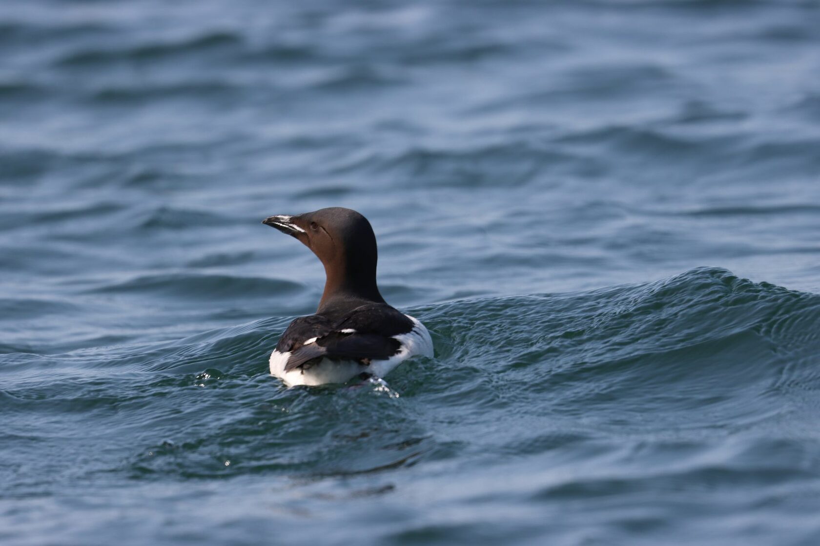 Полевые признаки. Массивная птица (800−1200 г), сходна с тонкоклювой кайрой. Отличается от нее более короткой шеей и более массивным клювом, вдоль темного надклювья тянется заметная светлая полоска. Полет быстрый, прямолинейный. Прекрасный ныряльщик, но под водой не столь маневренна, как тонкоклювая кайра.